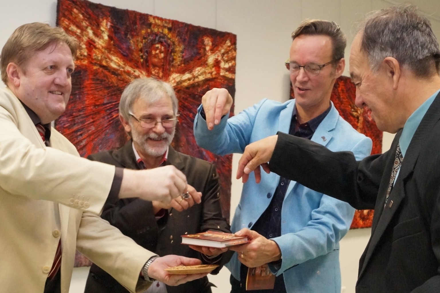 Vernisáž vyvrcholila uvedením knihy do čitateľského života, a to netradičným rituálom s názvom OZRNENIE (ukrajinsky ОЗЕРНЕННЯ – OZERNEŇNJA), keď autor spolu s ďalšími účinkujúcimi posypali knihu pšenicou z rodného kraja autora, aby zrnko-slovo padlo na úrodnú pôdu...
