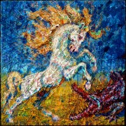 foto10: Súboj (z cyklu Proti-postoj). 2017, plátno, kombinovaná technika, 142 x 142 cm.